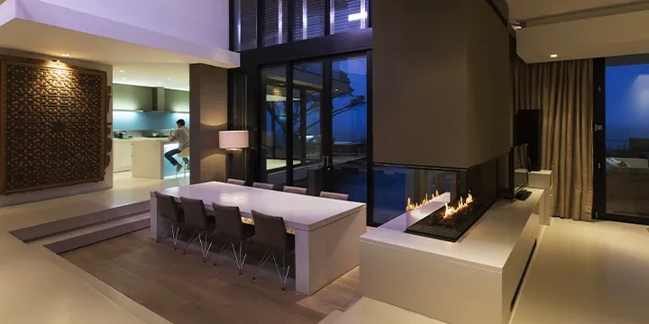 I camini con vista fiamma su tre lati e vetro completo offrono un design elegante e una visione panoramica del fuoco. La costruzione di questi camini è resa possibile grazie allo sbocco d'aria posizionato in alto, a differenza dei camini a bioetanolo standard, dove la mancanza di un vetro completo permette una ventilazione frontale.